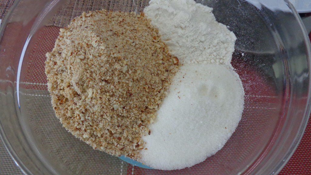 Mélanger les 190 g de sucre en poudre avec la farine et la poudre d’amande .