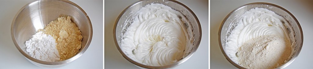 Mélanger ensemble dans un grand bol les amandes en poudre, la fécule de maïs et le sucre glace. Battre les blancs d’œufs en neige ferme puis ajouter le sucre en poudre 35 gr, battre de nouveau pendant 10 secondes de plus. Rabattre délicatement les blancs d’œufs dans le mélange précédent avec une spatule.