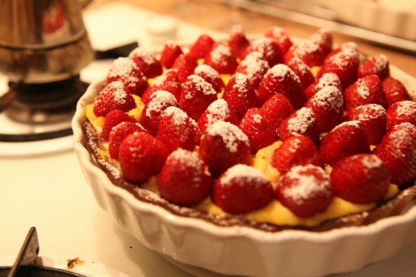 La crème est prête. Renversez sur le fond de tarte et, préparez les fraises, puis les mettre au dessus de la crème. Conservez au réfrigérateur en attendant la dégustation.