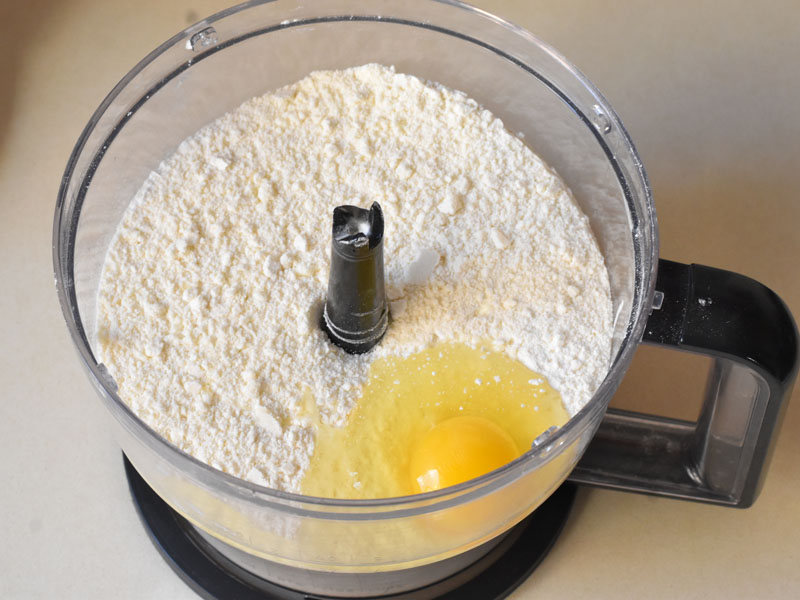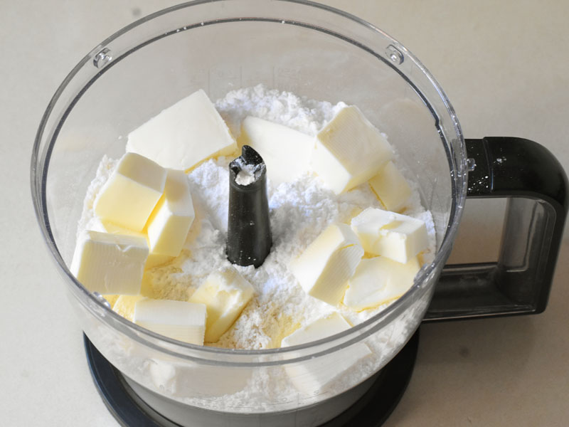 Placer la farine, le sucre et le beurre froid dans le bol du robot culinaire et mélanger jusqu’à obtention d’une pâte sablée.