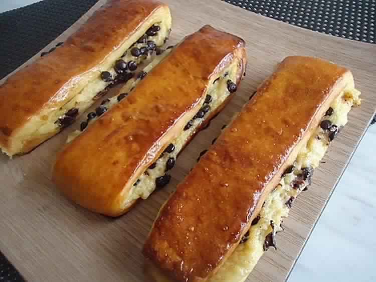 3.Étalez la pâte à brioche sur le plan de travail fariné en formant un grand rectangle.Badigeonnez la moitié du rectangle (dans la longueur) de crème patissière , puis saupoudrez de pépites de chocolat. Refermez la pâte en repliant le côté non “tartiné” sur la crème et les pépites de chocolat. Coupez des rectangles et déposez-les sur une plaque à pâtisserie (ou silicone, papier sulfurisé,…) en les espaçant suffisamment. Laissez-les reposez 1h dans le four à 35°.