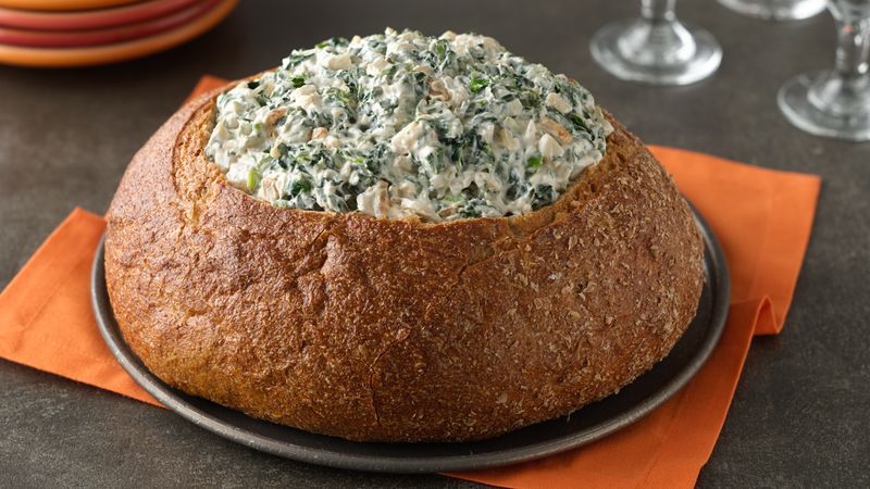 Quand la trempette est prête à servir, mettre le mélange dans le pain rond. Servir avec des petits morceaux de pain.
